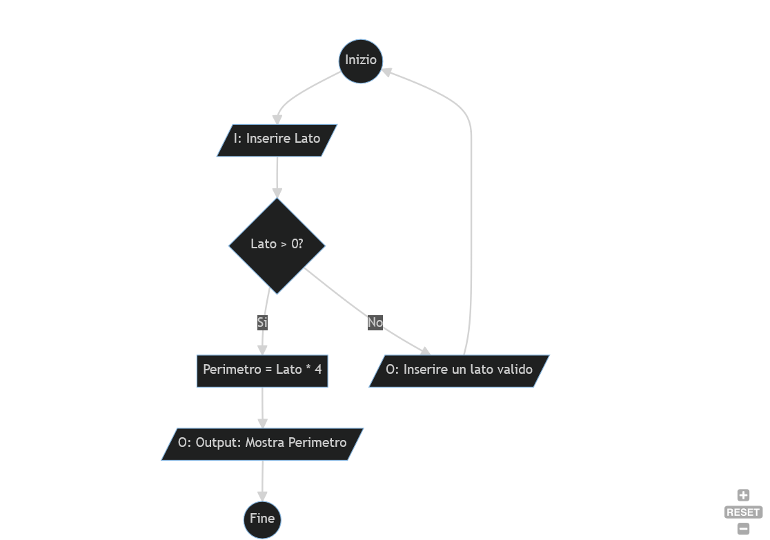Creiamo ora un flowchart per rappresentare l'algoritmo che calcola il perimetro di un quadrato. Seguiremo questi passaggi: